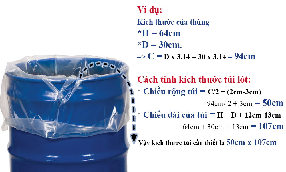 Chiều dài của túi = Chiều cao (H) + Đường kính (D) + 12cm-13cm cho phần nhô ra.